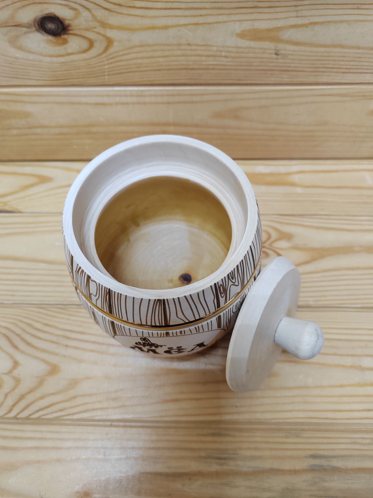 Бочонок деревянный для хранения меда. Объем бочонка 0,4 литра. Вмещает 0,5 кг меда. Выточен из цельного куска липы и покрыт внутри натуральным пчелиным воском. Бочонок небольших размеров, удобная крышка, можно поставить на стол для ежедневного использования.