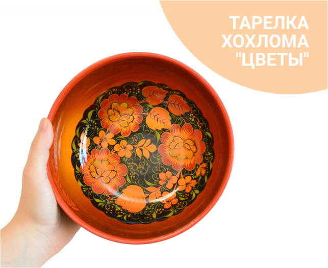 Чашка деревянная расписная. Тарелка хохлома "Цветы" D18,5 H7,5