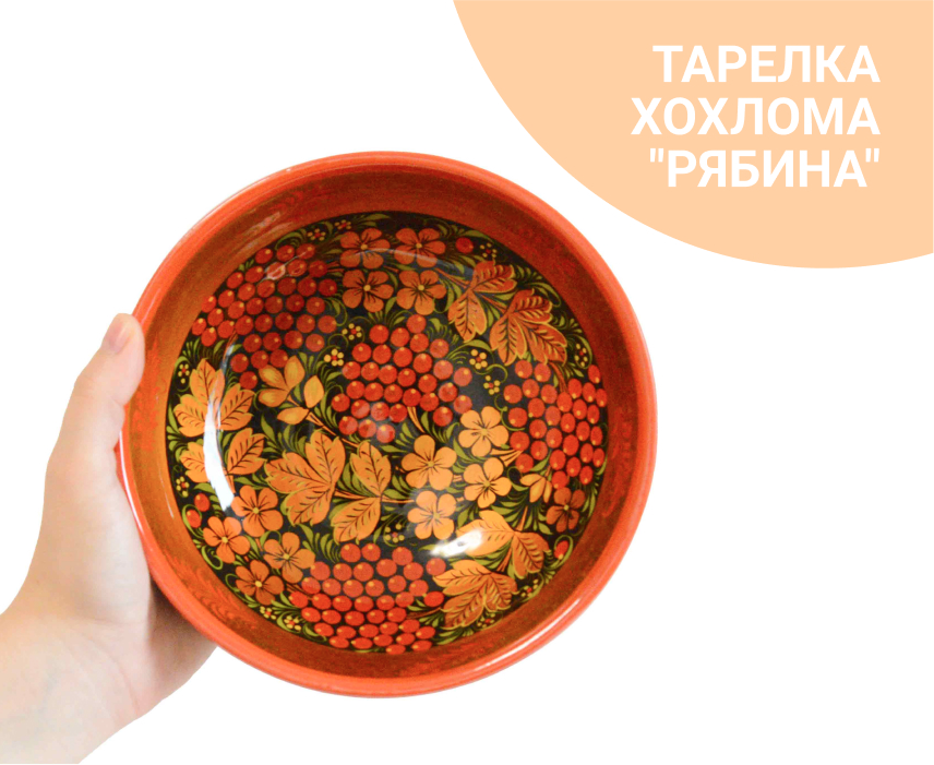 Чашка деревянная расписная. Тарелка хохлома "Рябина" D18,5 H7,5