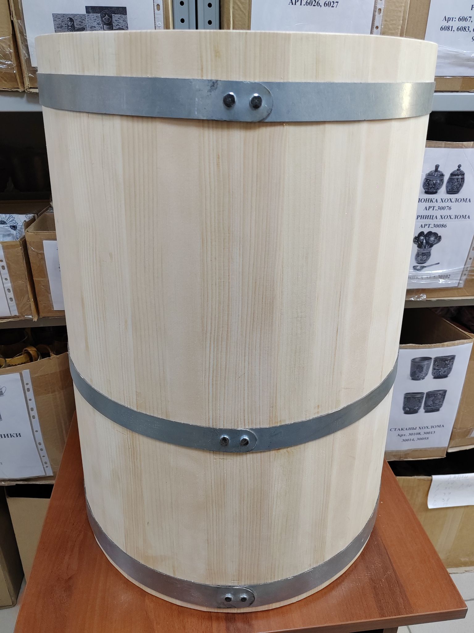 На данную кадушку ставится 3 широких обруча по 30-40 мм из толстого металла 1,5 мм.