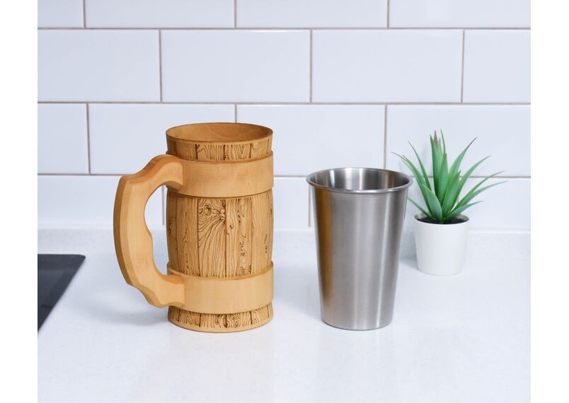 Кружка из дерева с вставкой из нержавейки. Объем 0,5 литра. Выглядит оригинально. Удобная ручка. Подходит для холодных и горячих напитков.