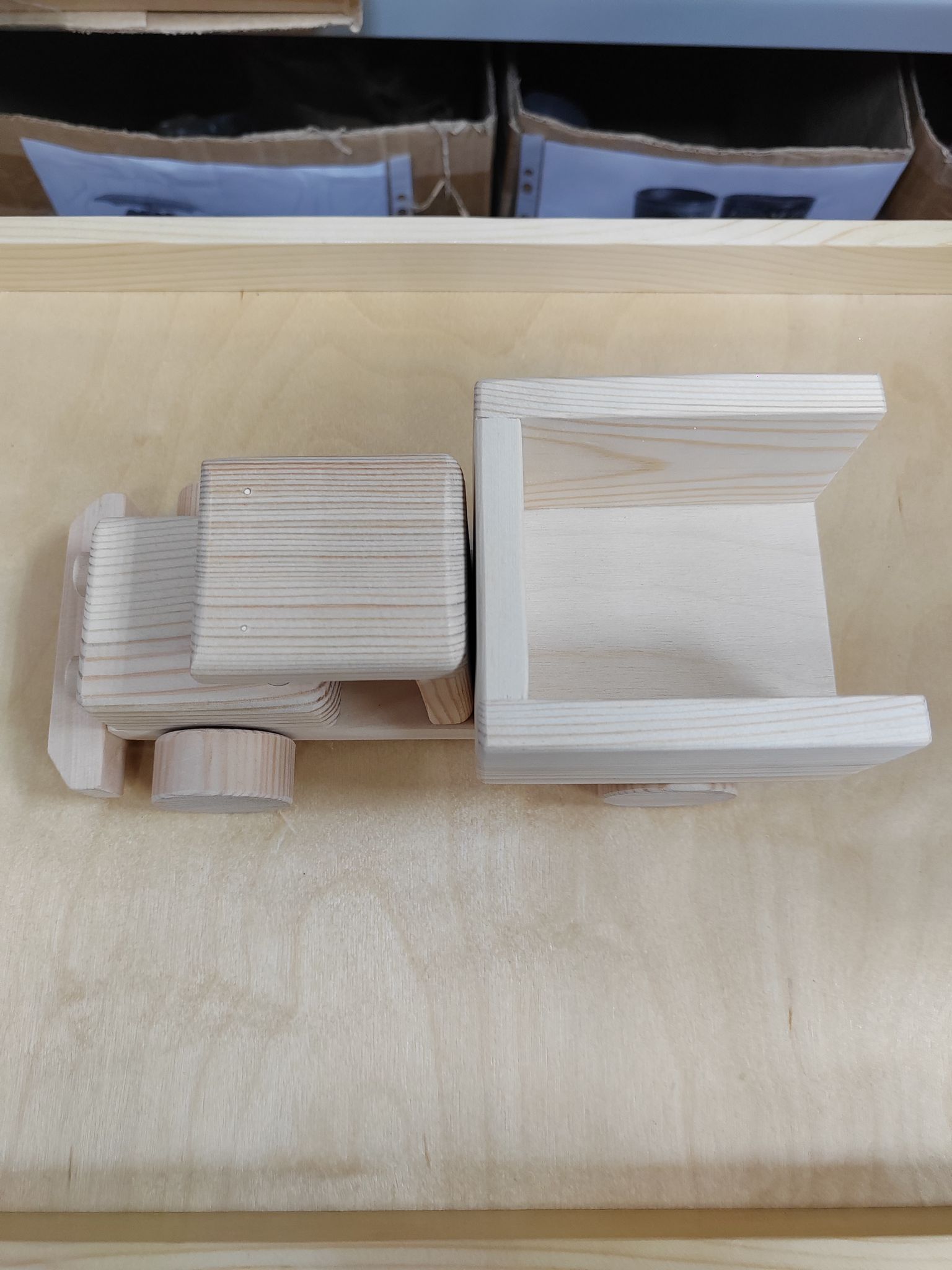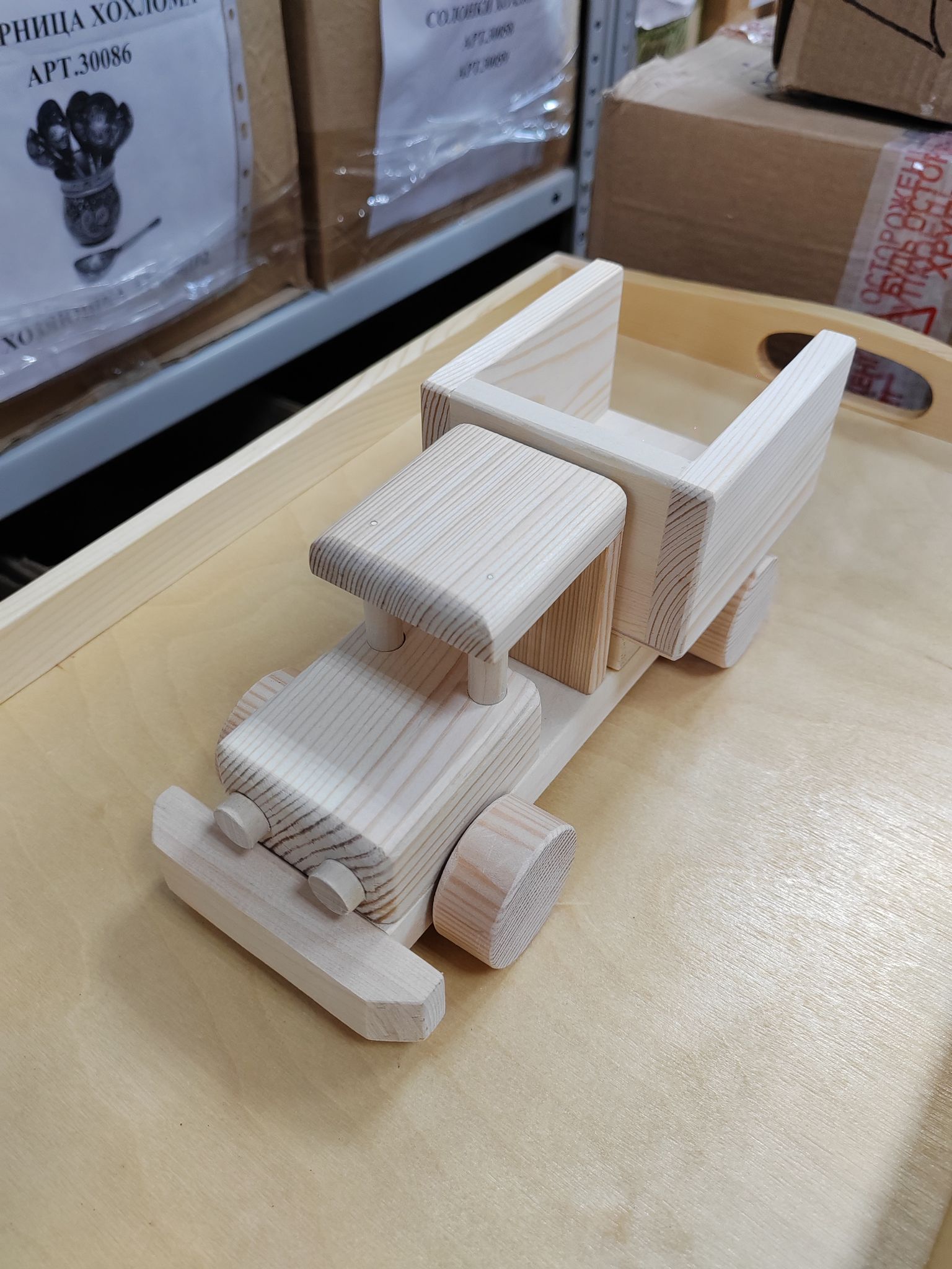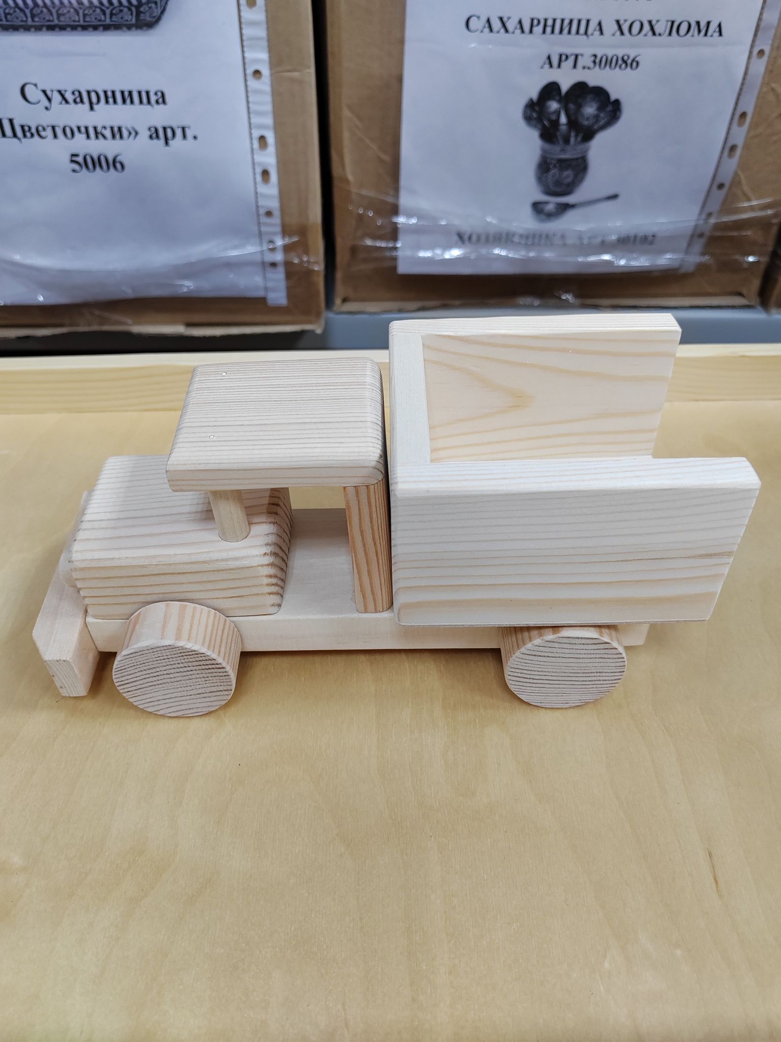 Игрушка деревянная - машина с кузовом. Все детали очень хорошо отшлифованы. Колеса вращаются. Кузов не поднимается.