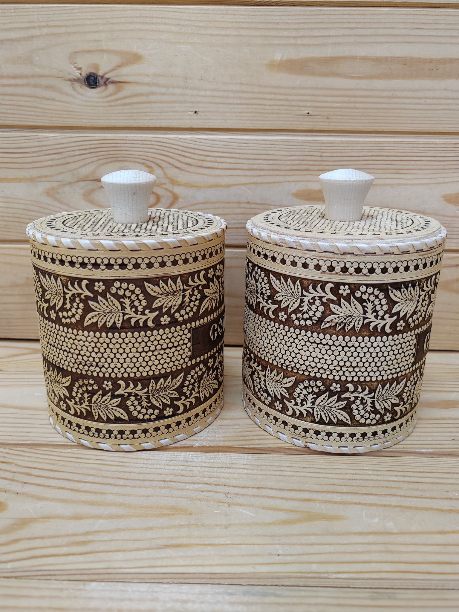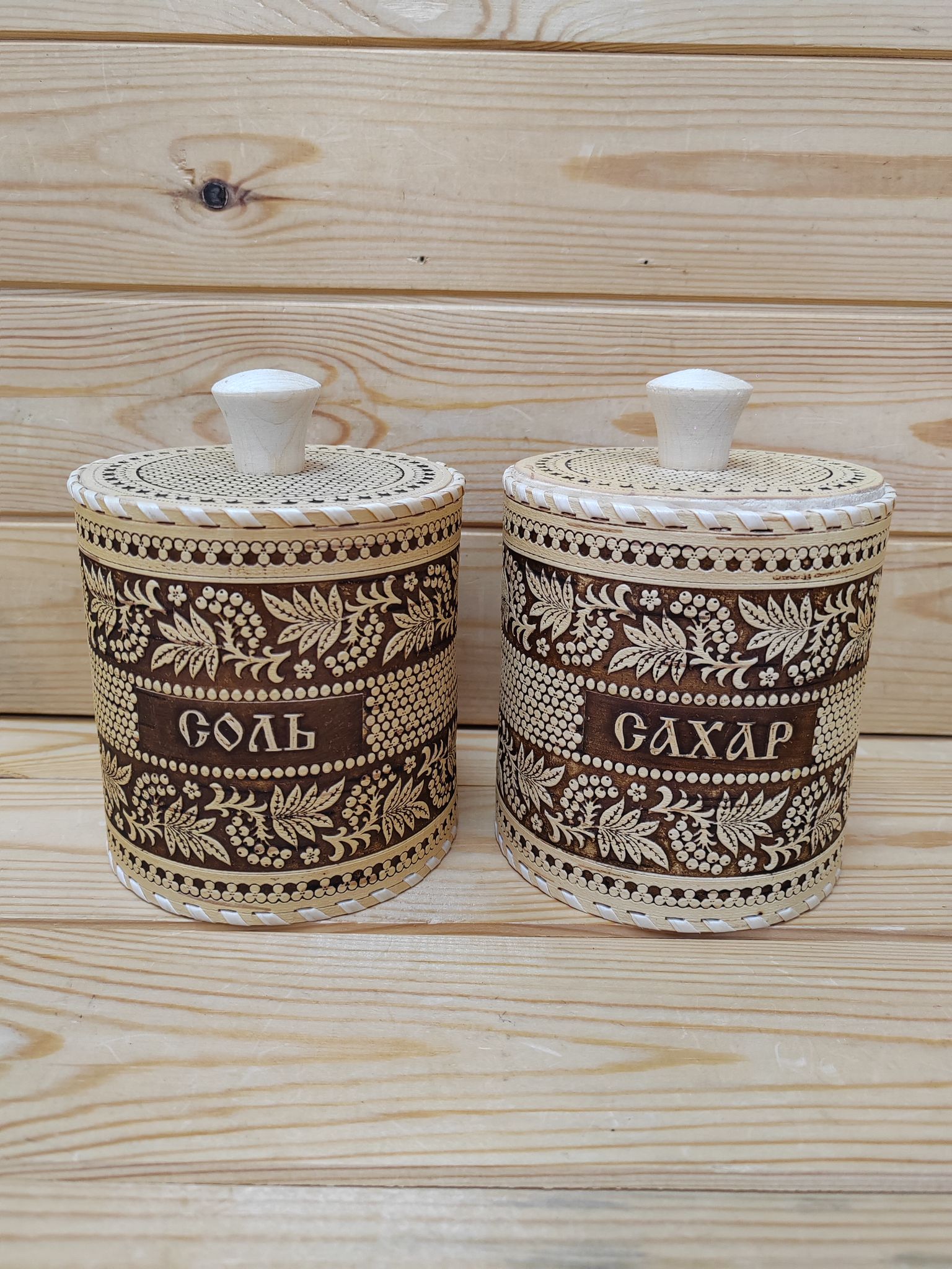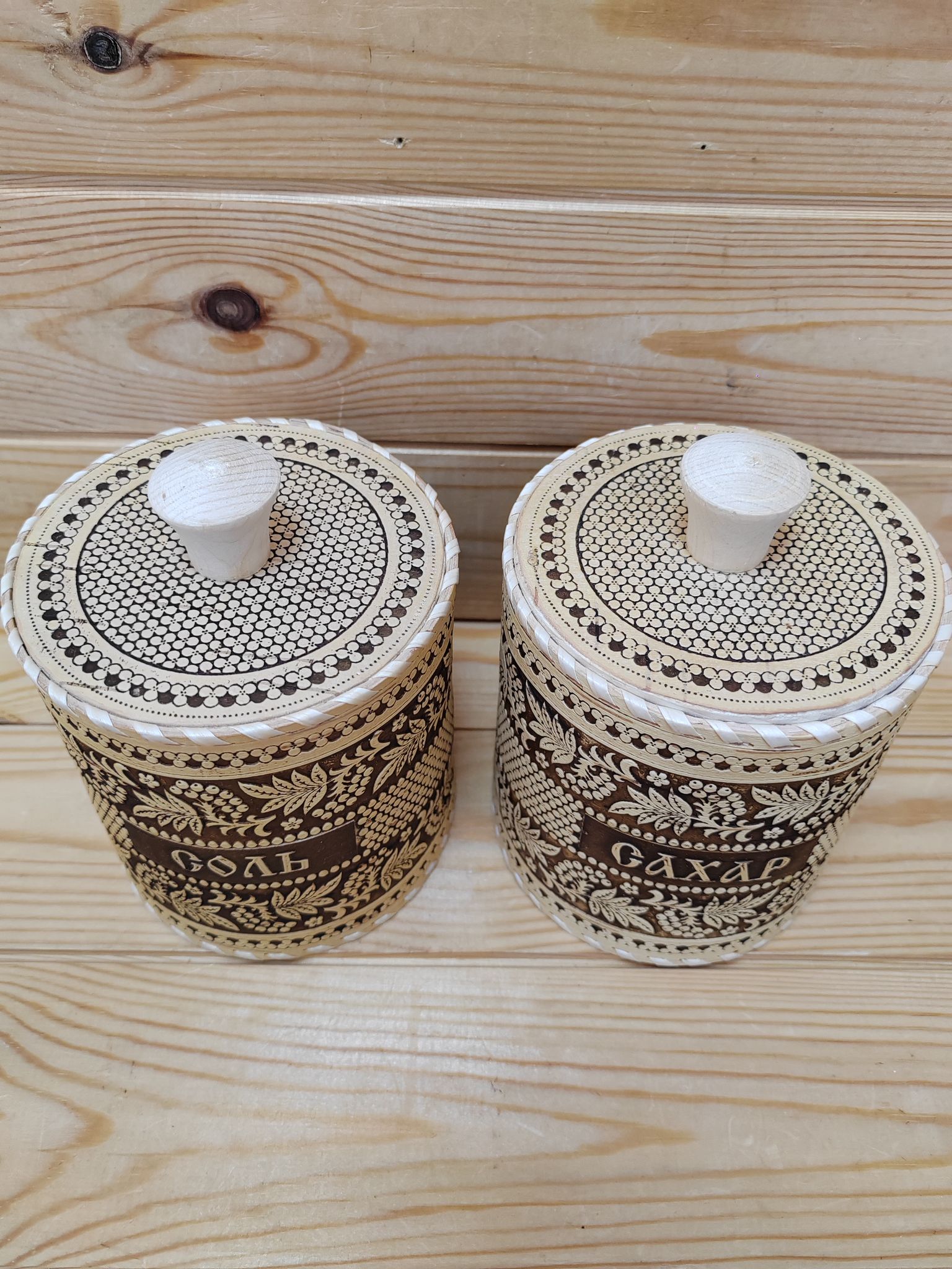 Красивый и практичный набор туесов для хранения соли и сахара. Крышка и донышко деревянные. Вмещает 700 г соли и 500 г сахара. Удобный размер для стола.