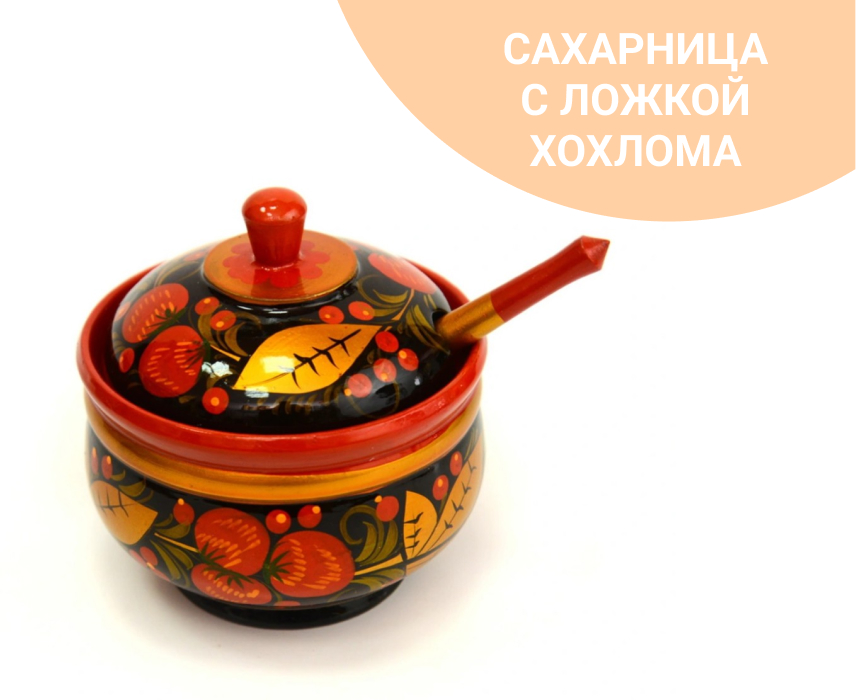 Сахарница деревянная небольших размеров с хохломской росписью. В комплекте с ложкой. Объем 0,29 литра. Можно использовать не только для сахара, но и для соли, специй, чая, кофе и т.д.