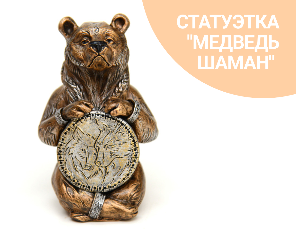 Статуэтка медведя небольших размеров из искусственного камня. Медведь шаман с бубном в руках.