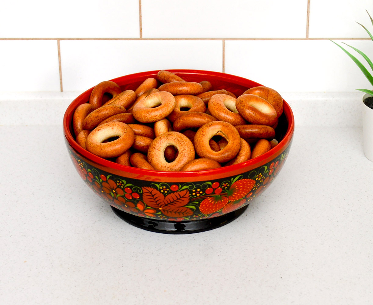 Посуда с хохломской росписью будет очень красиво смотреться на любой кухне. Её используют по прямому назначению, а не только для декора. Роспись делается мастерами вручную. Лаковое покрытие сохраняет яркость и насыщенность цвета, придает прочность изделию. Все материалы экологичны и натуральны. Всё выполнено по фабричным технологиям.