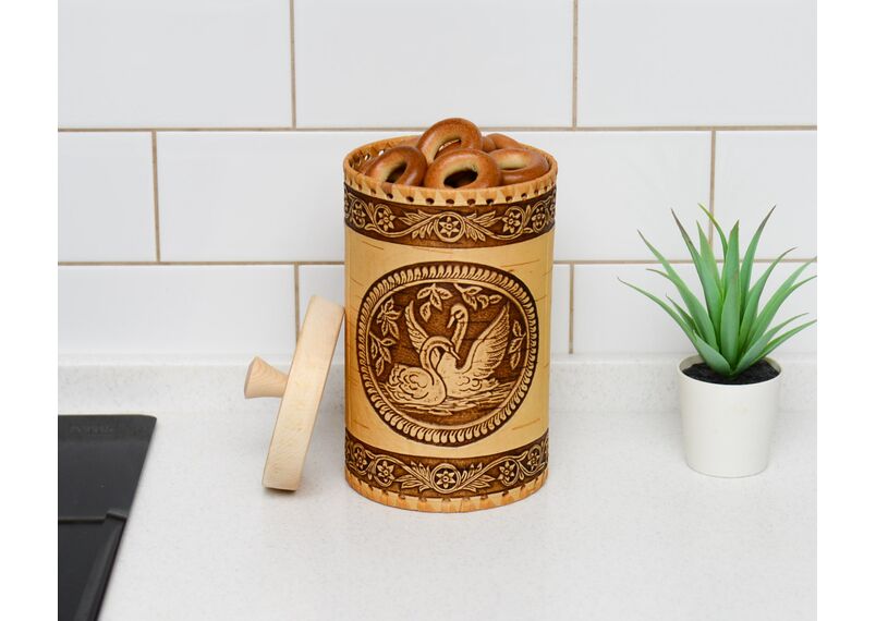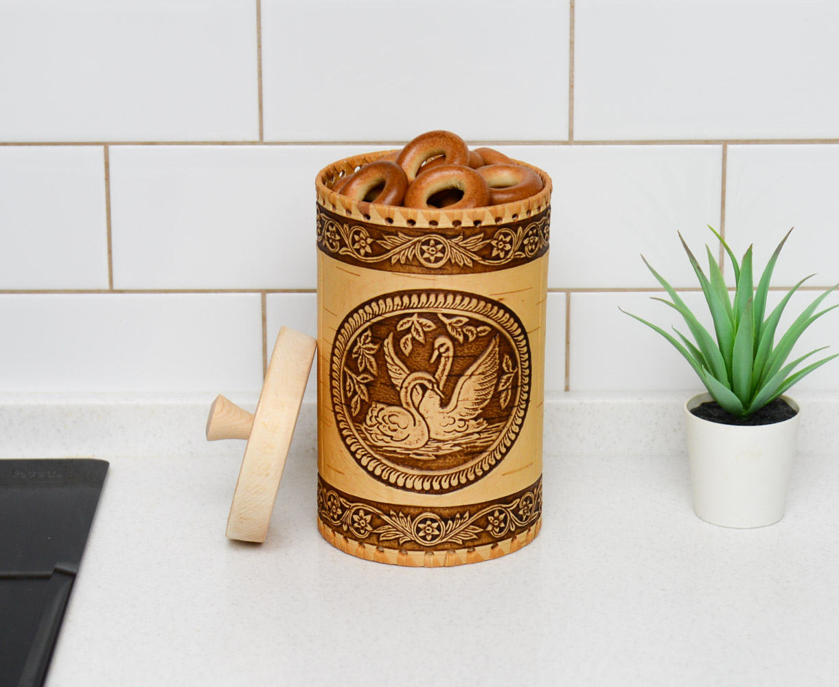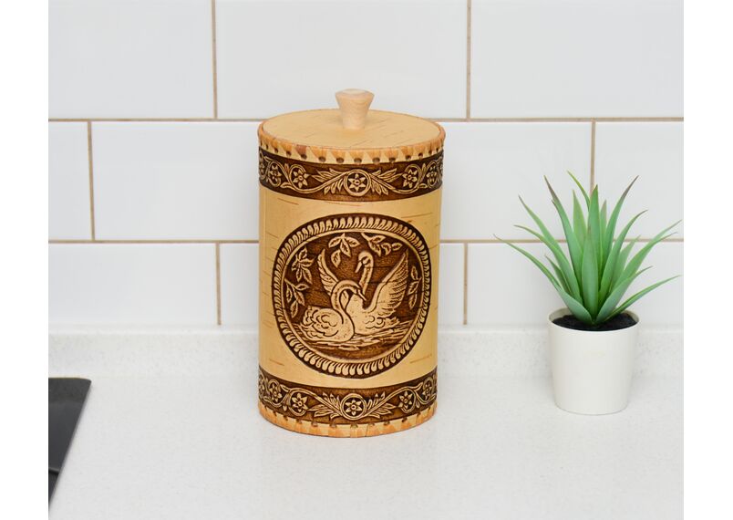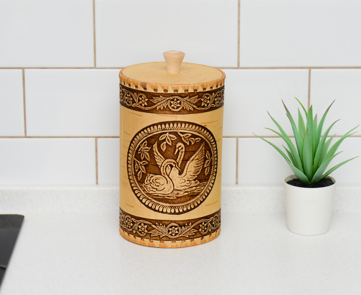 Красивый и вместительный туес из бересты с изображением лебедей станет незаменимым помощником на вашей кухне. Отлично подойдет для хранения чая, соли, сахара, круп. Приятный на ощупь. Удобный в использовании.